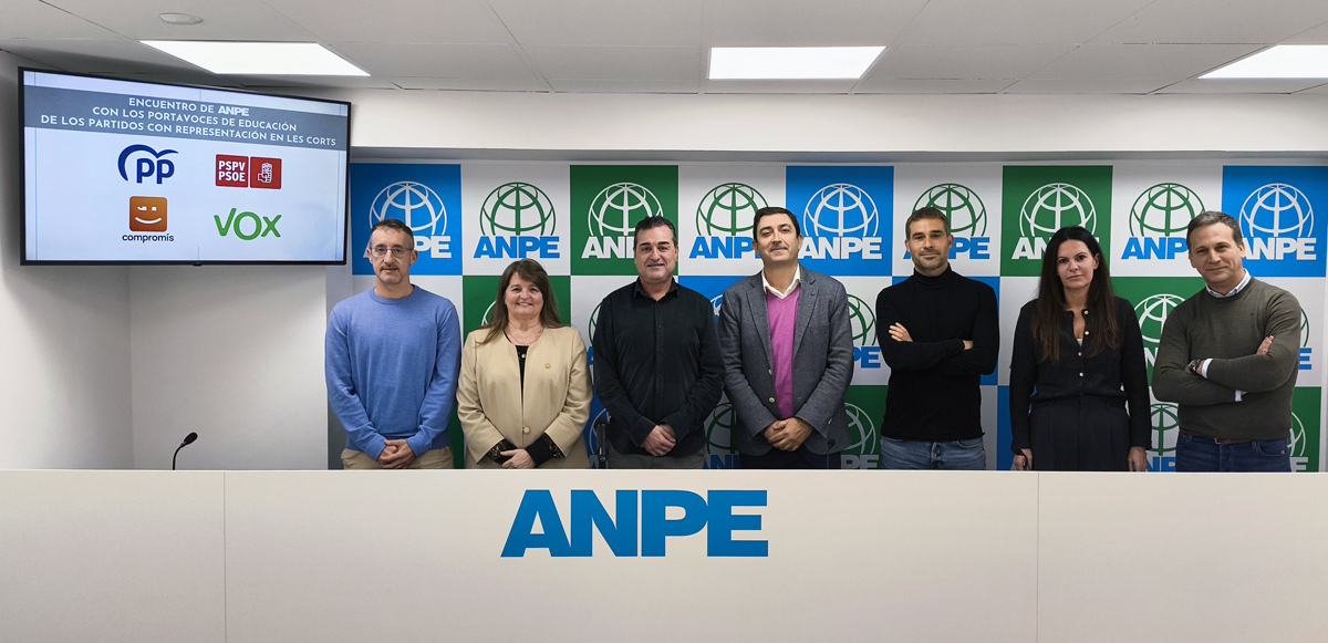 A la reunión han asistido los portavoces de educación Beatriz Gascó, por el PP; José Luis Lorenz, por el PSOE; Gerard Fullana, por Compromís; y Julia María Llopis, por Vox. Por parte de ANPE han participado Francisco Venzalá, presidente de ANPE nacional; José Mª Cuadrado, secretario estatal de organización; y Lauren Bárcena, presidente de ANPE C.Valenciana.