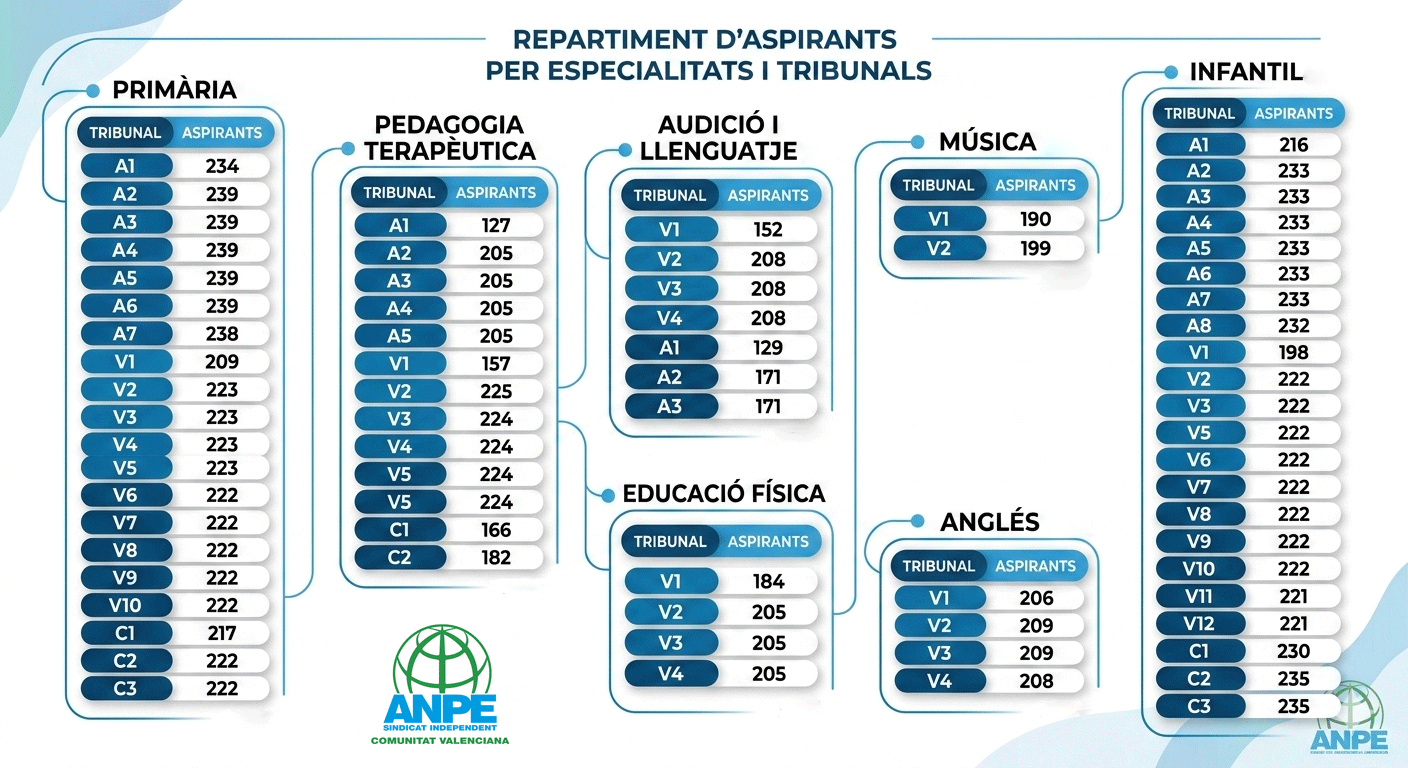Esto ha movido a la Conselleria a eliminar tribunales de Castellón y/o Alicante en muchas especialidades. Así pues, las especialidades de Inglés, Educación Física y Música solo dispondrán de tribunales en Valencia, mientras que la especialidad de Audición y Lenguaje no contará con tribunales en Castellón.