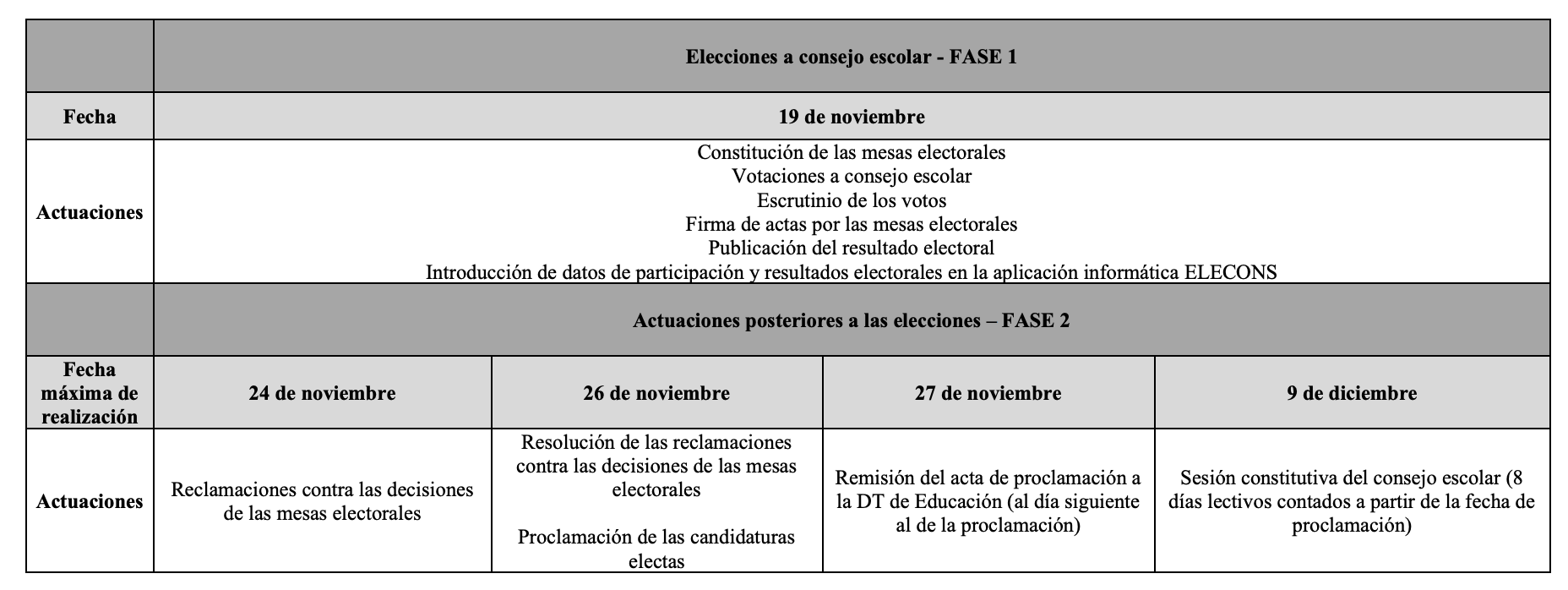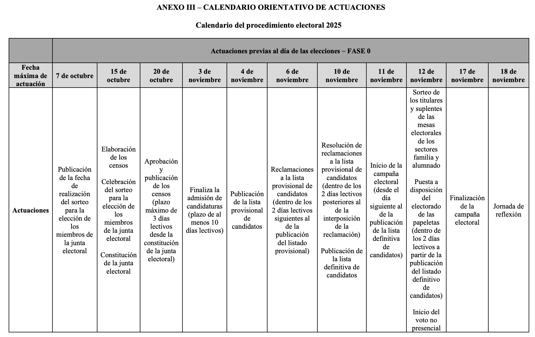 El día 19 de noviembre de 2025 se llevarán a cabo elecciones para la renovación y constitución de los consejos escolares de los centros docentes no universitarios sostenidos con fondos públicos de la Comunitat Valenciana que impartan segundo ciclo de Educación Infantil, Educación Primaria, Educación Especial, Educación Secundaria Obligatoria, Bachillerato, Formación Profesional, enseñanzas de régimen especial y educación de personas adultas, así como las escuelas infantiles de primer ciclo de titularidad pública.