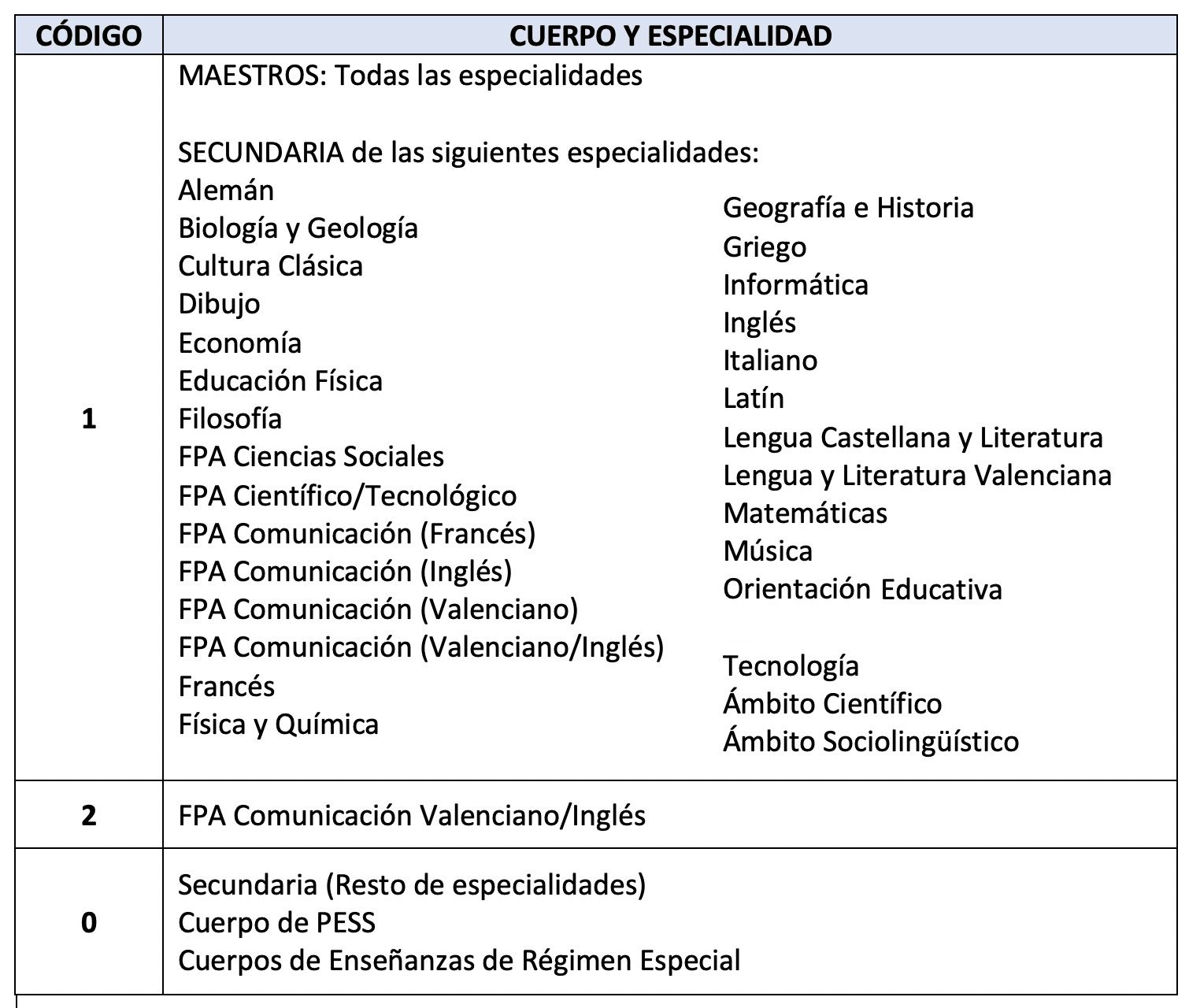 Códigos de las Especialidades del Cuerpo de Maestr@s