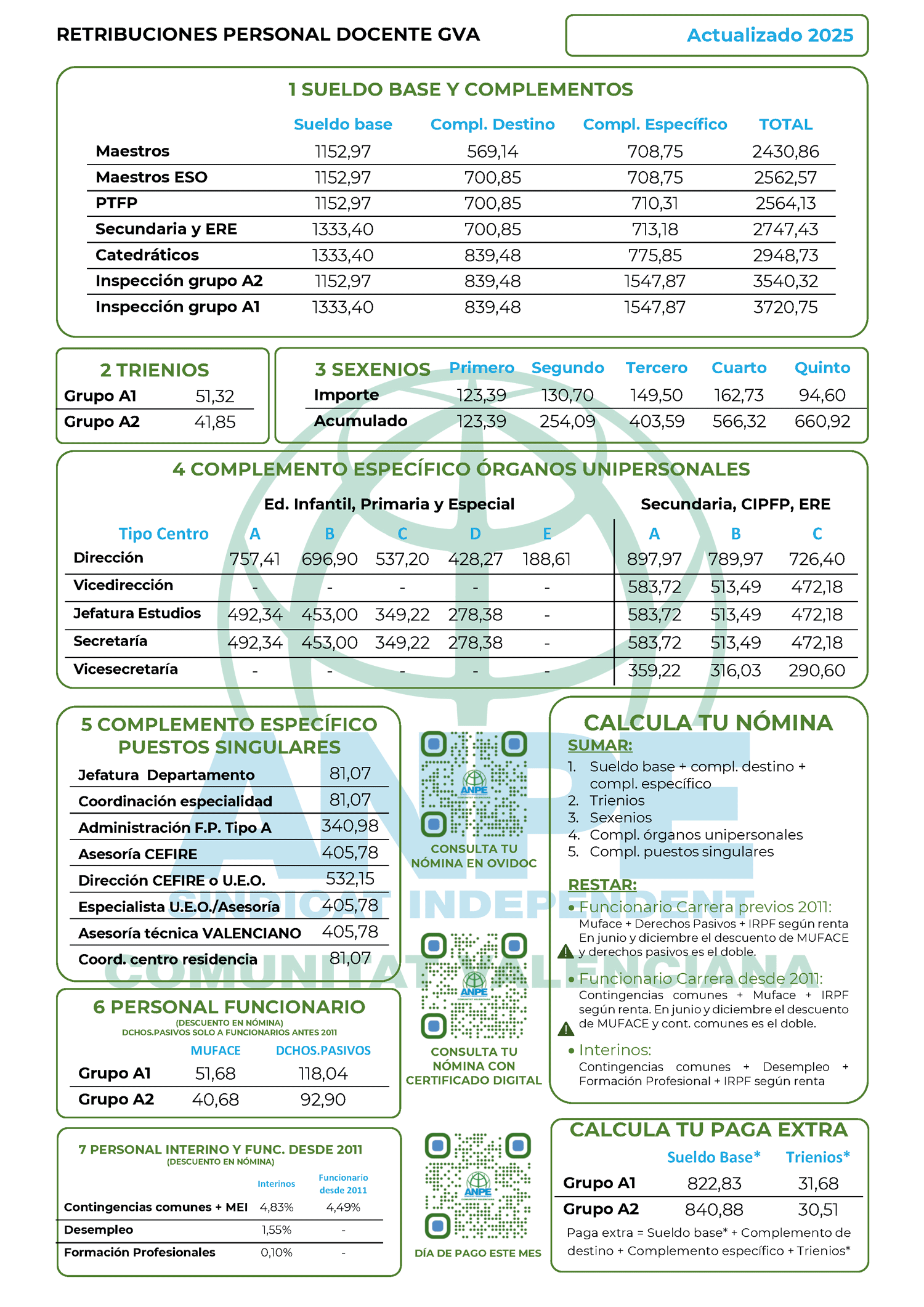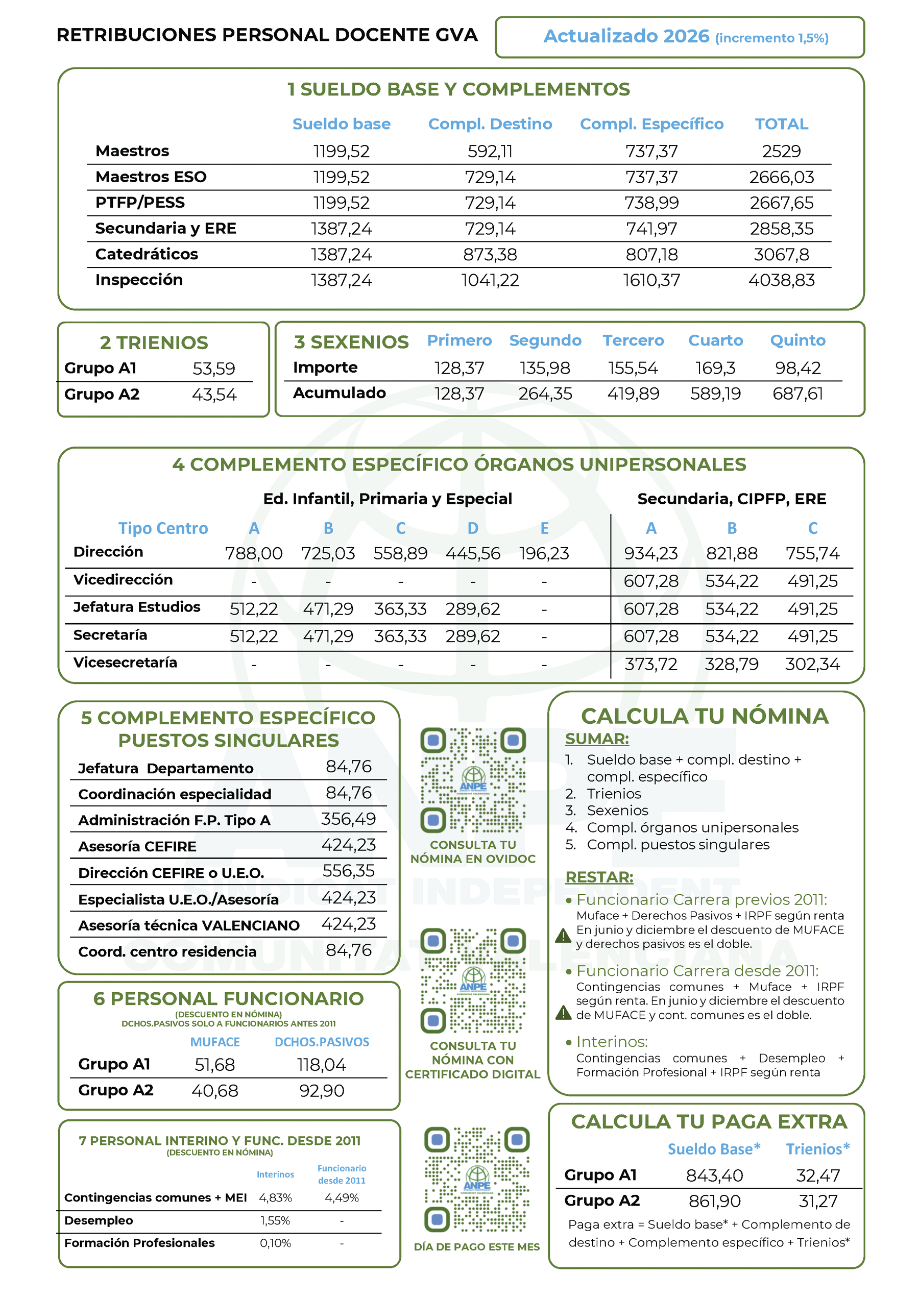 ANPE te informa todos los años de las retribuciones de los funcionarios docentes de los diferentes Cuerpos por Comunidades Autónomas informando de los posibles incrementos retributivos que se hayan podido producir en las correspondientes Leyes de Presupuestos.