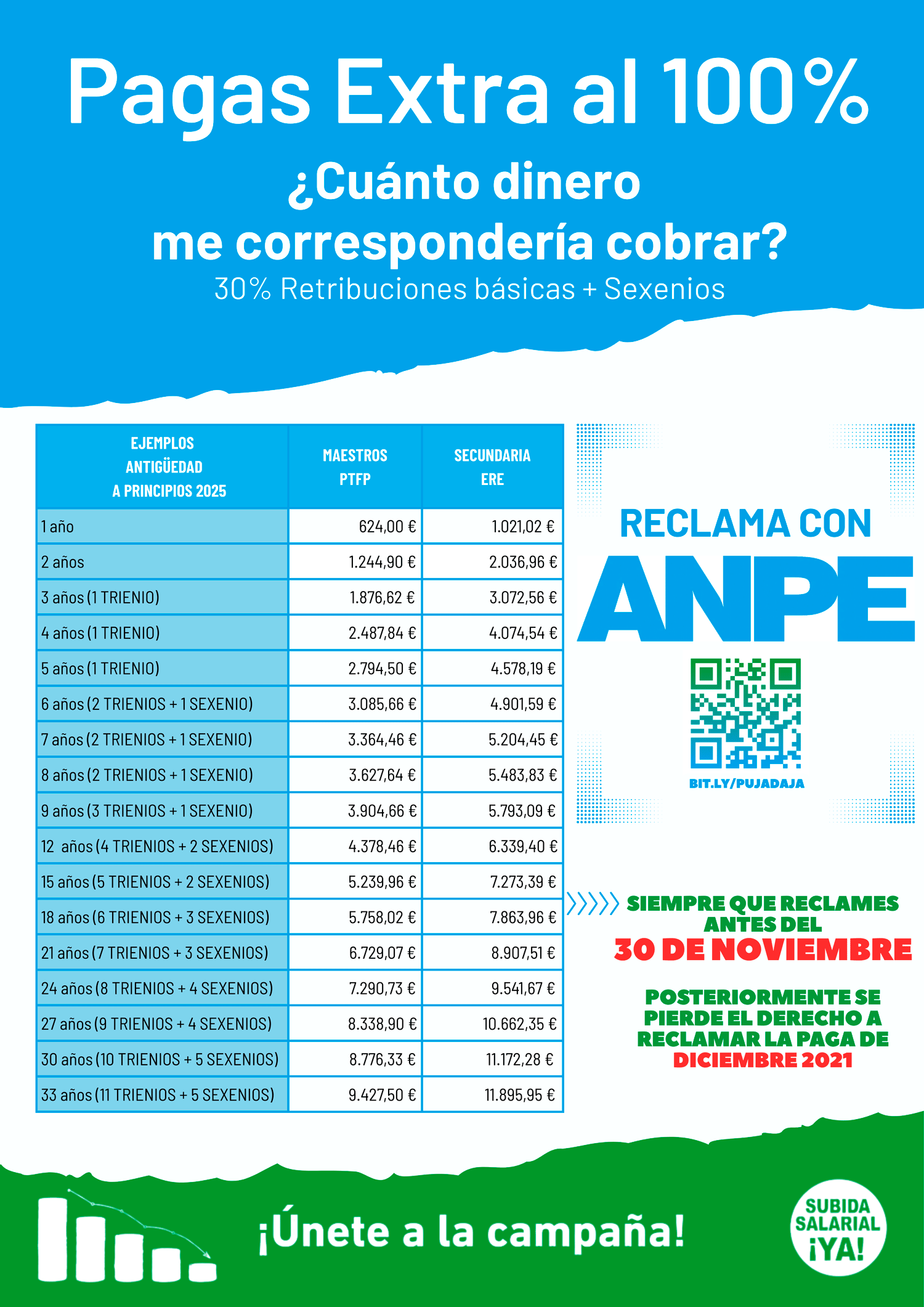 Desde ANPE estamos llevando a cabo una campaña exigiendo al Gobierno Central y a todas las Comunidades Autónomas el cobro del 100% de las pagas extras de los meses de junio y diciembre para todos los docentes. A pesar de que el Estatuto Básico del Empleado Público (TREBEP) establece que las pagas extraordinarias deben equivaler a una mensualidad de retribuciones básicas y complementarias, esto no se cumple, manteniéndose recortes de las retribuciones tanto en la parte estatal como en la parte autonómica de la nómina, lo que hace que la extra se reduzca aproximadamente un tercio de su cuantía.