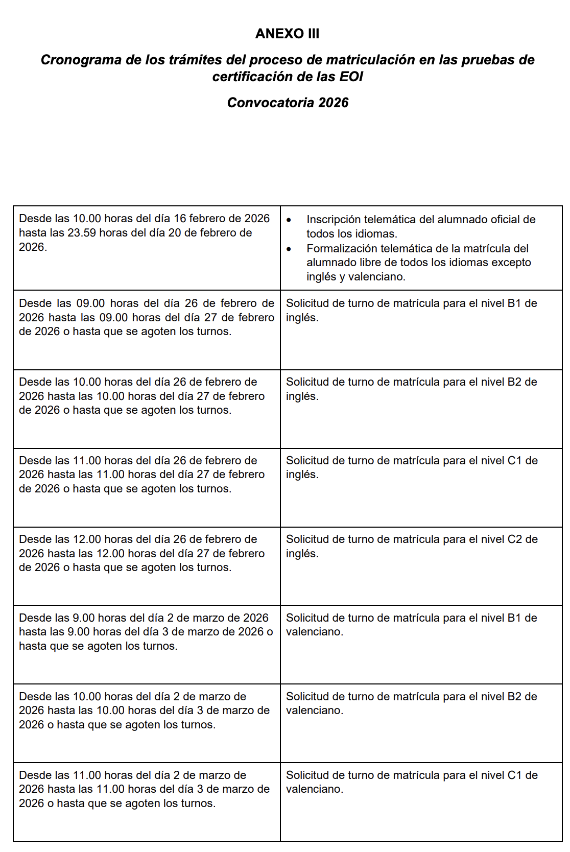 En el caso de los idiomas inglés y valenciano de todos los niveles habrá que hacer una solicitud de turno de matrícula como requisito previo a la matriculación del alumnado libre. Los enlaces a las diferentes solicitudes de turno se encontrarán en la página web https://proveseoi.gva.es.