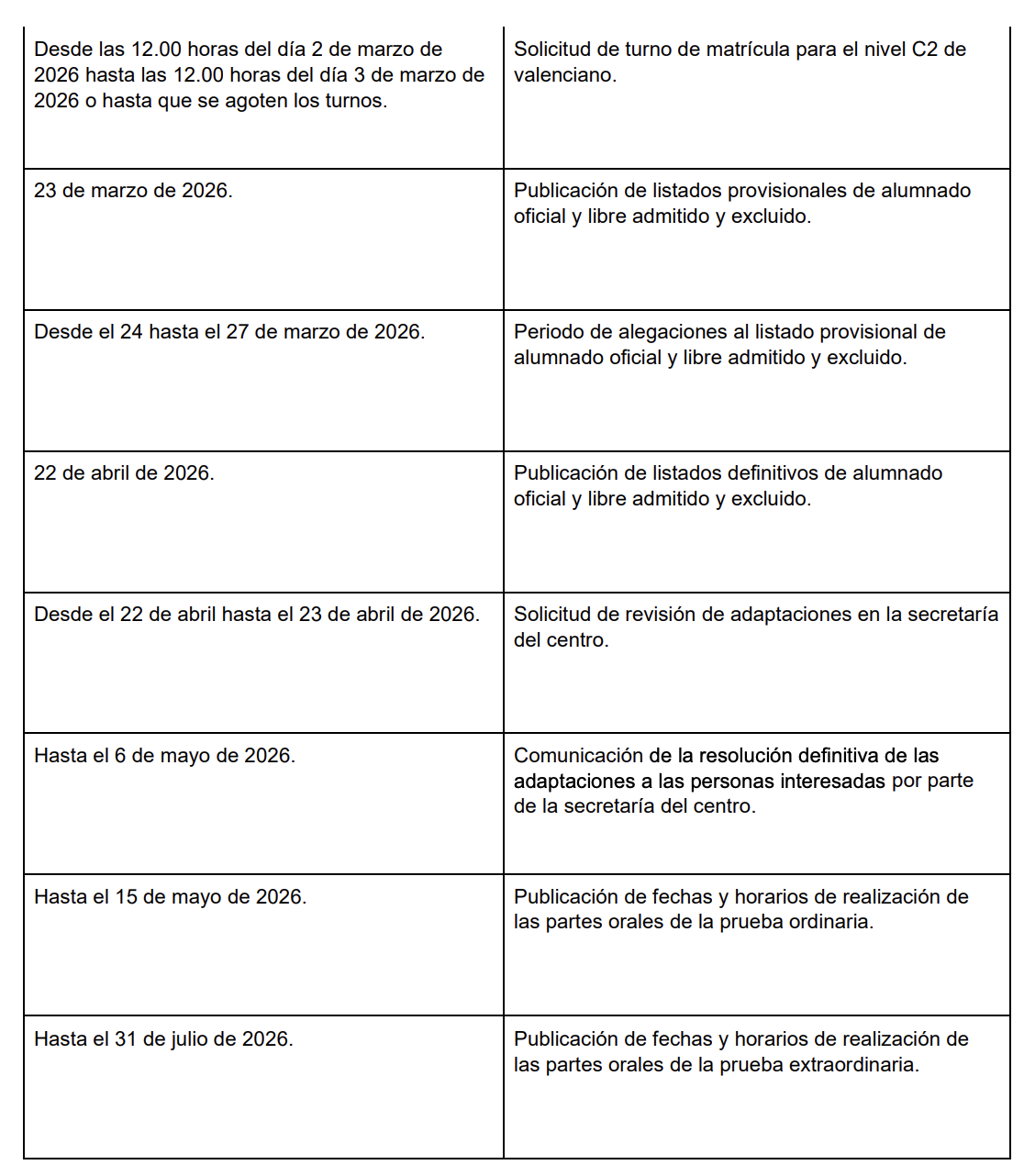 Se ha publicado hoy en el DOGV la Resolución por la cual se establecen el calendario y el proceso de inscripción y matriculación para la realización de la prueba unificada de certificación (PUC) en las escuelas oficiales de idiomas de la Comunitat Valenciana, correspondientes a la convocatoria 2026.